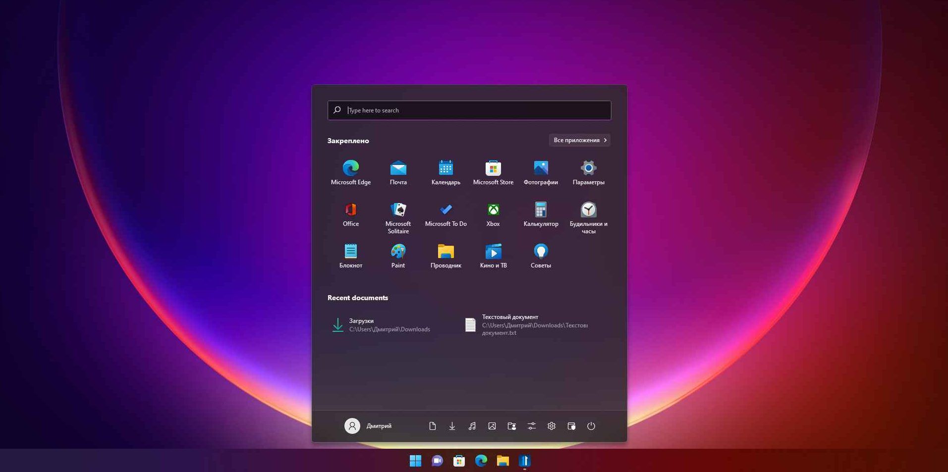 Рассмотрим пользовательский интерфейс ОС Windows 11. После загрузки ОС на экране компьютера появляется Рабочий стол с ярлыками и значками (пример 2.3).