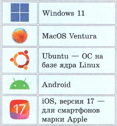 Компьютеры работают под управлением различных операционных систем. Иногда на одном компьютере даже устанавливают несколько ОС. Наиболее распространённые ОС для настольных компьютеров и ноутбуков: Windows, MacOS, Linux. Операционные системы Android и iOS устанавливаются на смартфоны и планшеты (примеры 2.1 и 2.2).