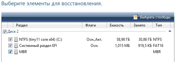 * Запустите программу Acronis True Image. Далее: выбрать резервную копию, выберите Tiny_11_core_64_rus_office_19_full_b1_s1_v1.tib, восстановить диски и разделы, восстановить определенные разделы, выделить пункты как на картинке.